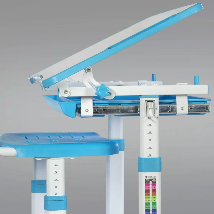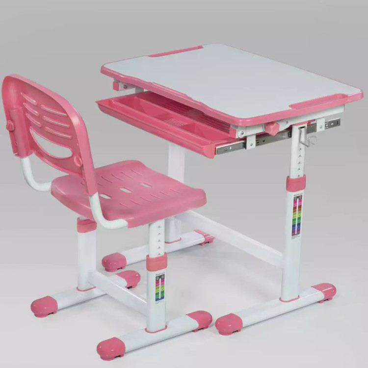 ارتفاع این میز و صندلی بدون باز و بست کردن پیچ و مهره، (برای میز در ۱۱ حالت(22cm) و برای صندلی در ۶ حالت(12cm) مختلف) قابل تنظیم است، دارای کشویی جاکتابی، آویز کیف بوده و صفحه میز تا ۴۰ درجه زاویه، قابل تنظیم می باشد.