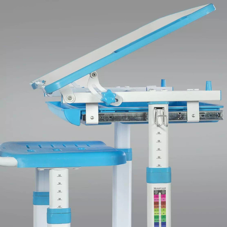 این محصول در ۵ طرح کارتونی و ۴ رنگ متفاوت تولید می شود. ارتفاع این میز و صندلی بدون باز و بست کردن پیچ و مهره، برای میز در ۱۱ حالت (۲۲ سانتیمتر) و برای صندلی در ۶ حالت (۱۲ سانتیمتر) مختلف قابل تنظیم است، دارای جا کتابی کشویی و آویز کیف مدرسه بوده و صفحه میز تا ۴۰ درجه زاویه قابل تنظیم می باشد.