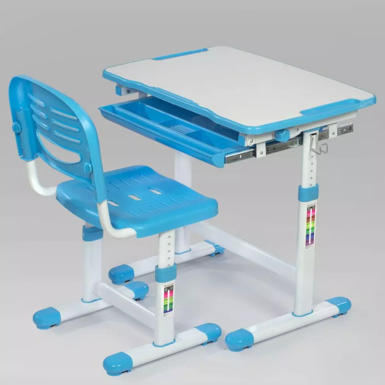 ارتفاع این میز و صندلی بدون باز و بست کردن پیچ و مهره (برای میز در ۱۱ حالت(۲۲cm) و برای صندلی در ۶ حالت (۱۲cm) مختلف) قابل تنظیم است، دارای جا کتابی کشویی، آویز کیف بوده و صفحه میز تا ۴۰ درجه زاویه قابل تنظیم می باشد.